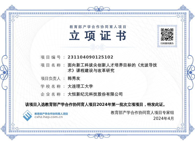 依托大恒光电协同育人项目,光电人才培养再结硕果。在教育部公布的第三批国家级一流本科课程认定结果中(教高函〔2025〕9号),大连理工大学申报的《光波导技术》课程成功入选。